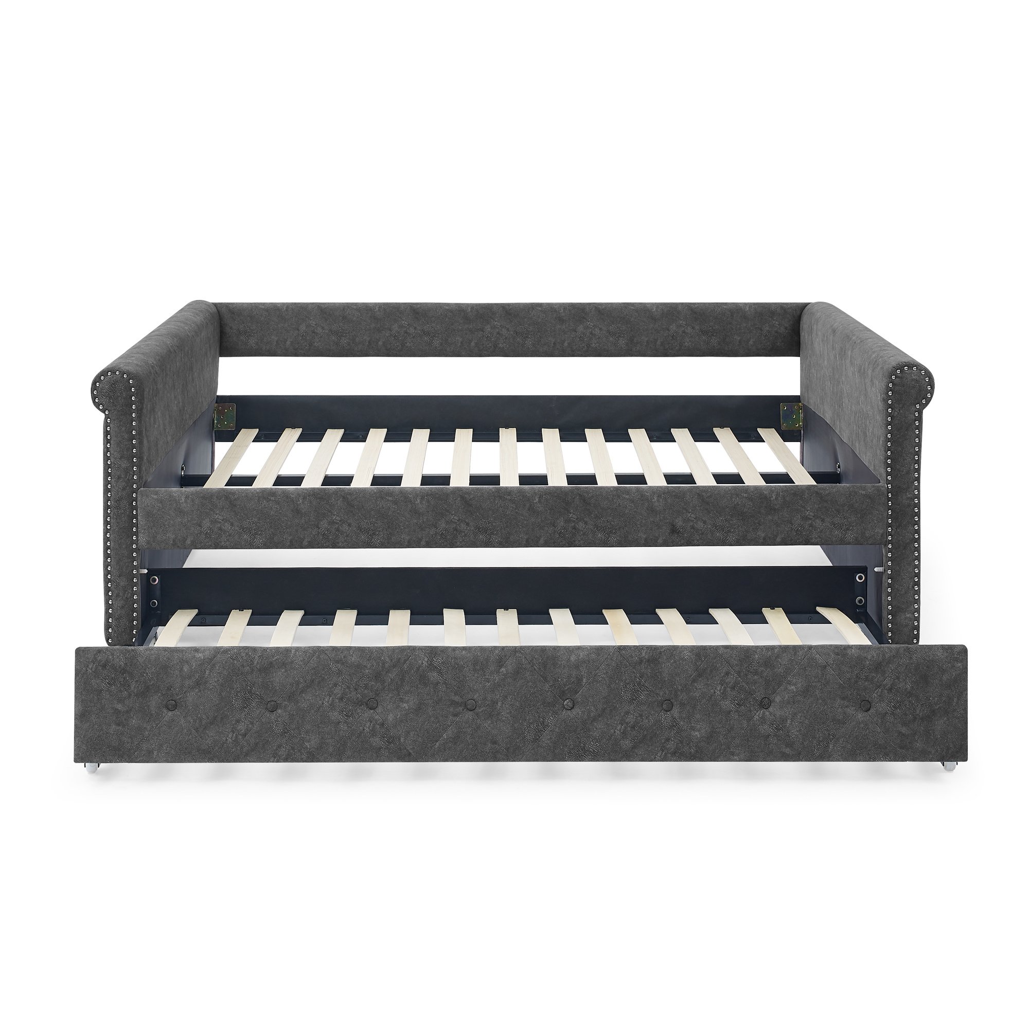 Reinforced Frame. The frame of this daybed with trundle is crafted from a combination of eucalyptus wood and MDF board to effortlessly hold up to 500lbs. It can fit two twin sized mattresses, giving more space for guests. The trundle is equipped with smooth casters for easy pull-out.