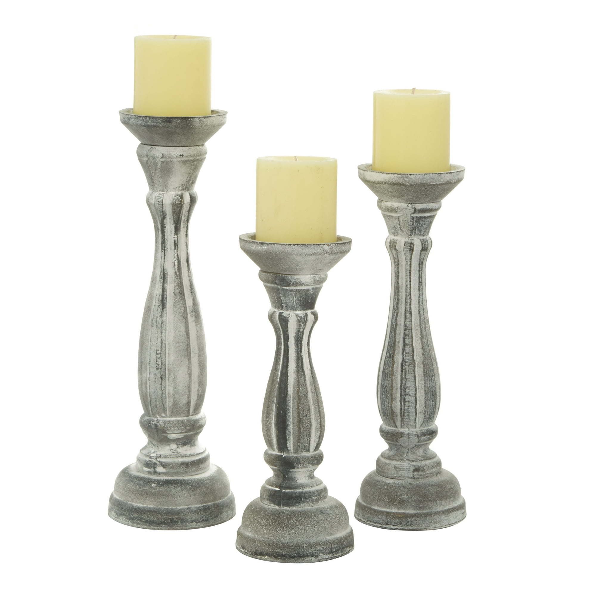 DecMode Traditional Gray Carved Wood Candle Holder with Whitewashed Finish, Set of 3 15", 13", 11"H