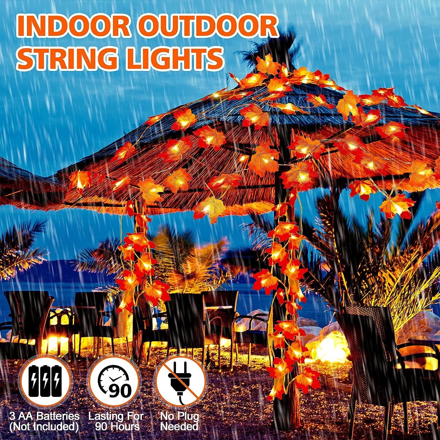INDOOR OUTDOOR STRING LIGHTS: Battery operated autumn garland with lights, 3 AA batteries for each (Not Included). No plug in to hang anywhere you like, great outdoor indoor fall decor for home.