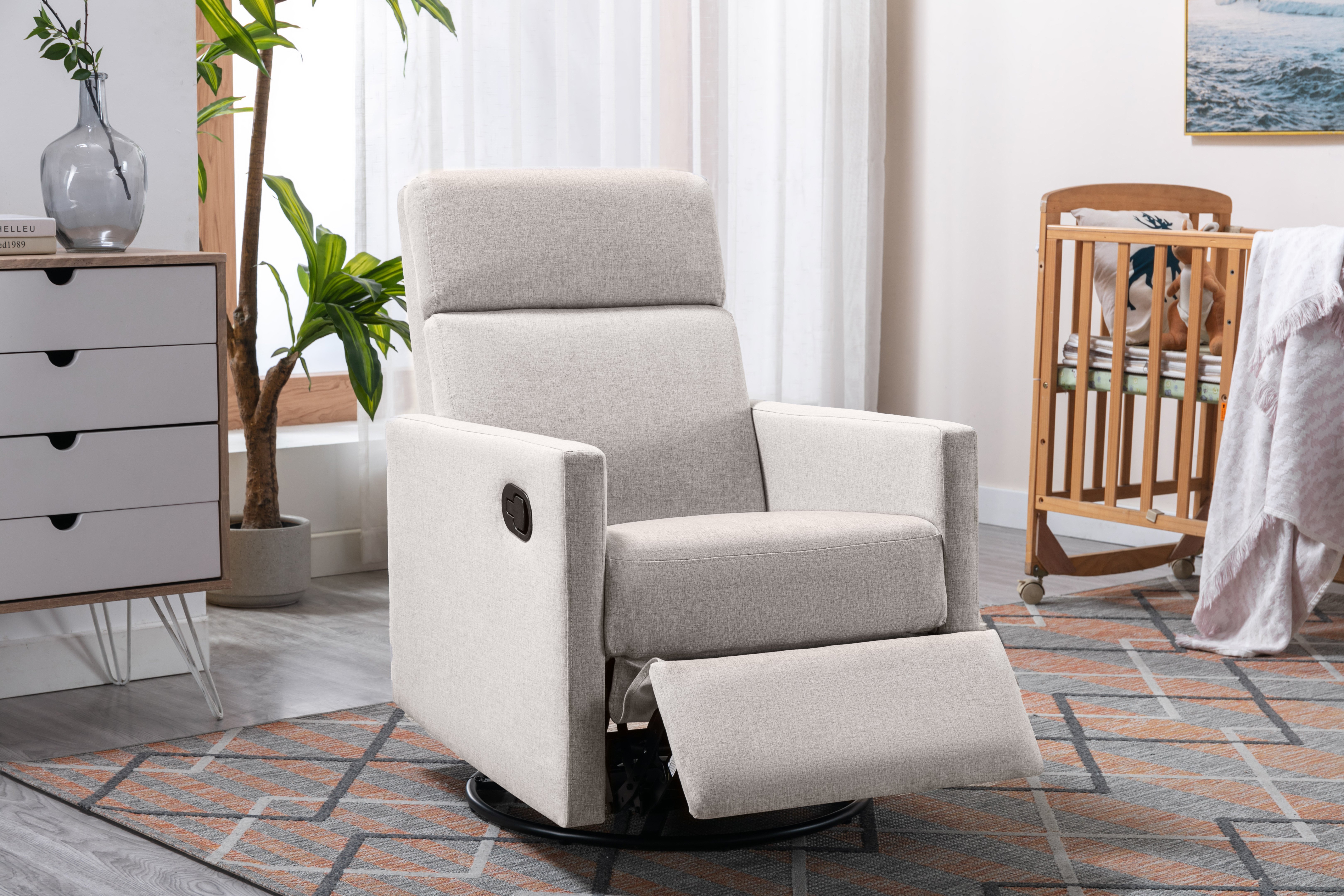 COMFORTABLE & STURDY:This swivel recliner is composed of comfortable and soft fabrics with high-density soft foam padded seat and back, which perfectly wraps your body and brings you the ultimate comfort. Sturdy metal construction with a swivel base and solid wood frame ensures the recliner chair can hold more weight, and durable enough to function properly for years.