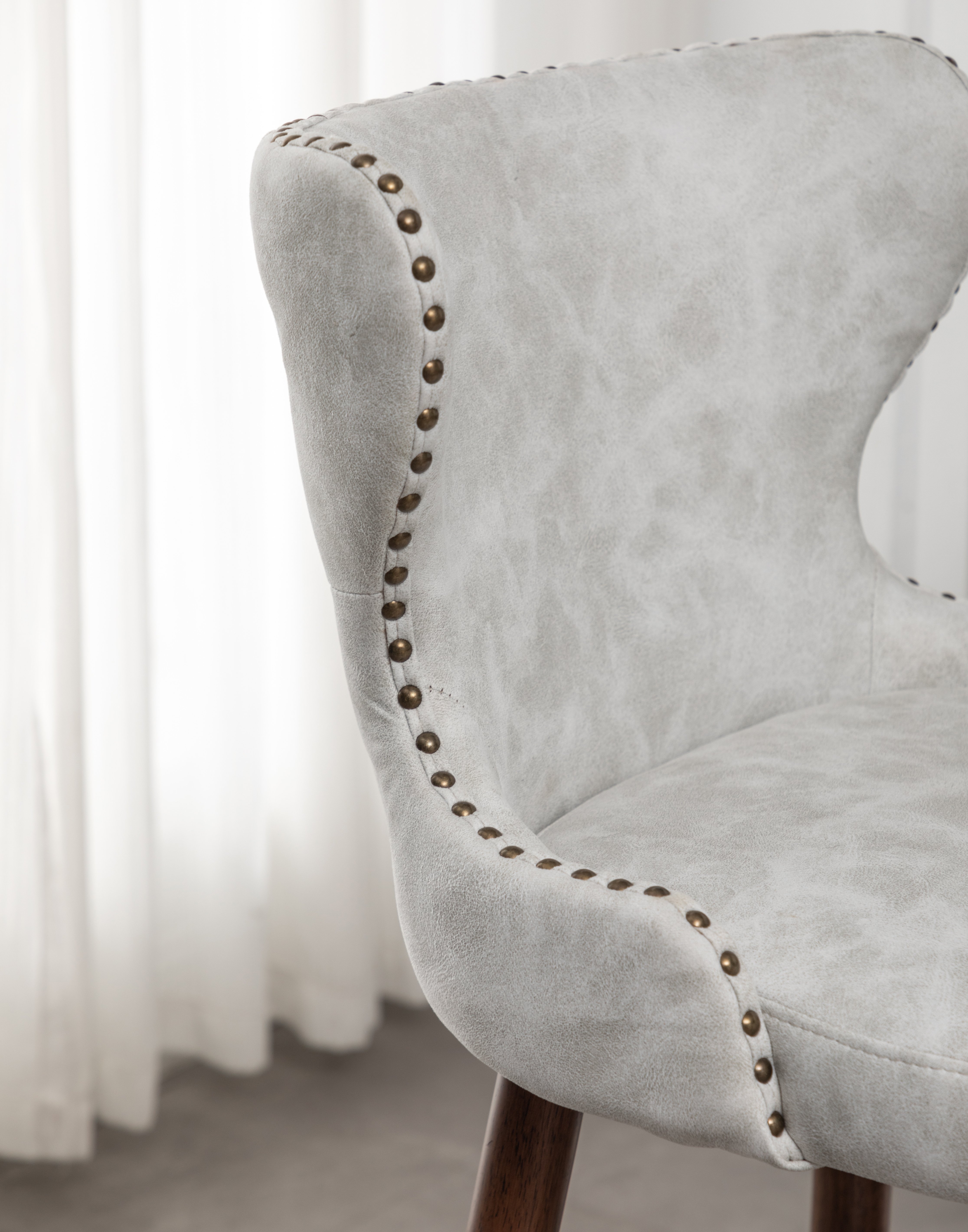 A button tufted back and curved wing-back seat with nailhead trim bring the mid-century appeal