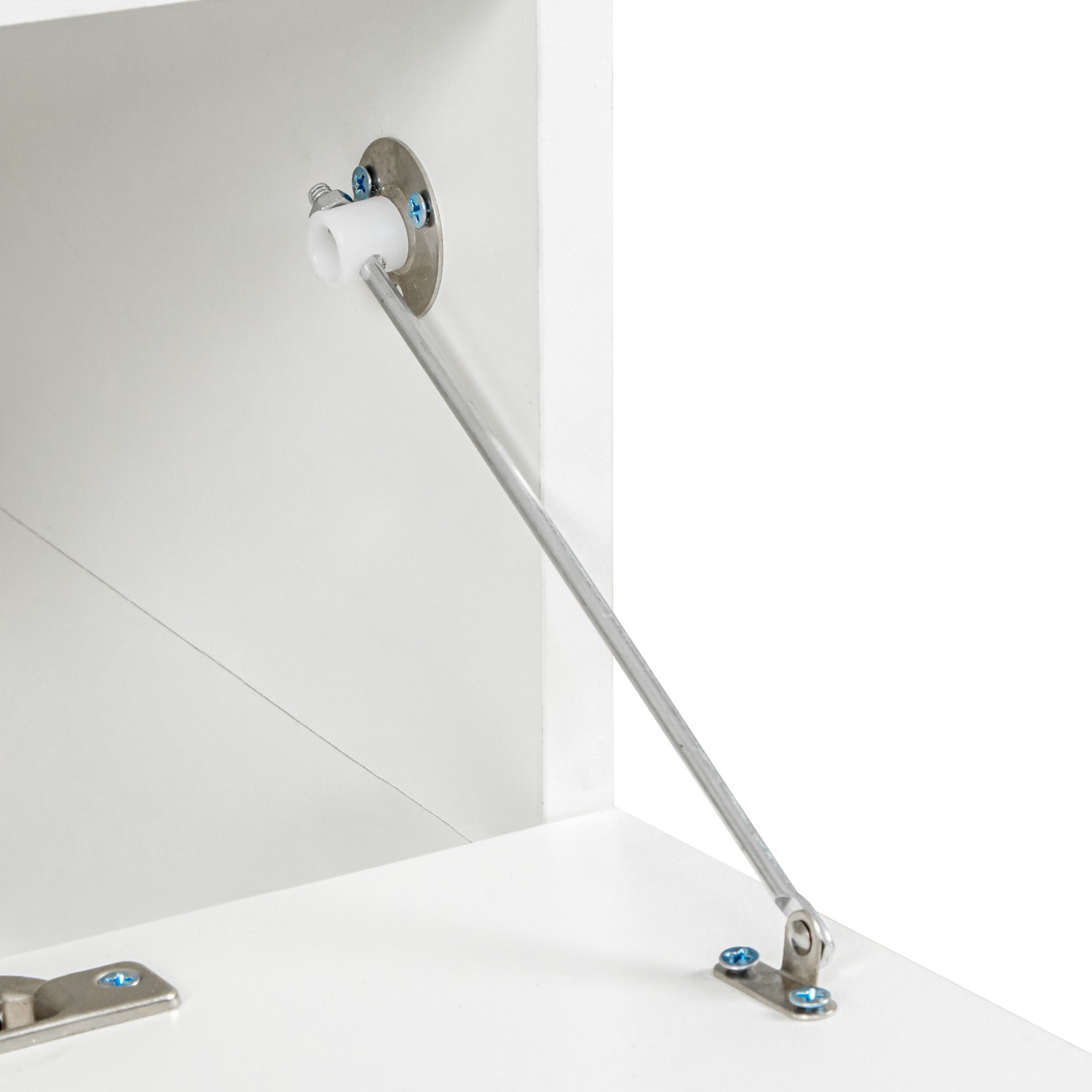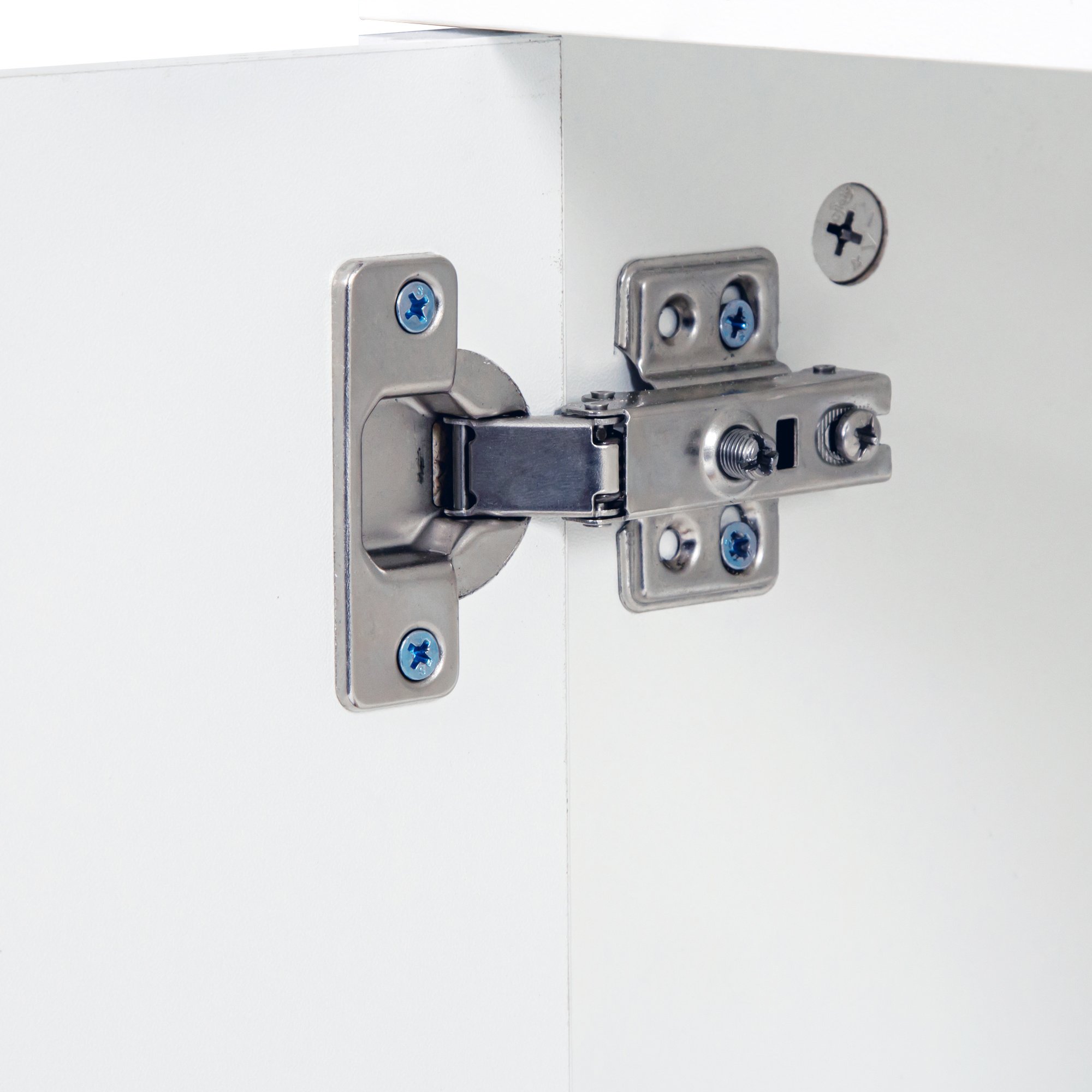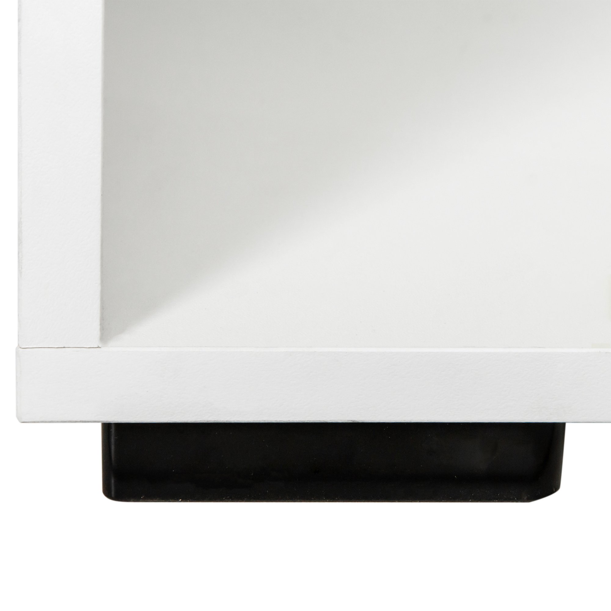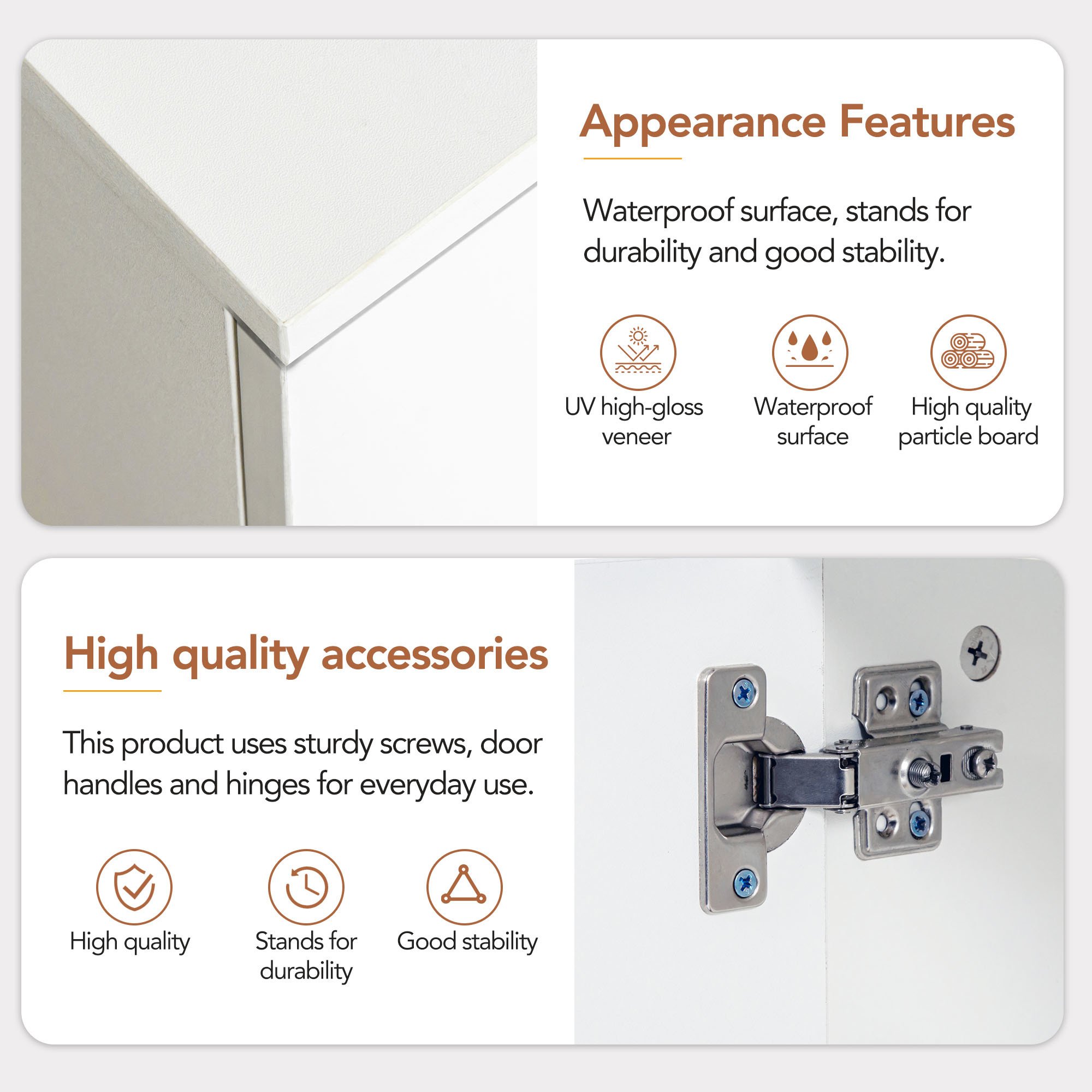This product uses sturdy screws, door handles and hinges for everyday use. 15mm high quality particle board is used to build the frame, and the table top can carry 110 LBS. Black plastic feet aim to prevent friction with the ground during movement.