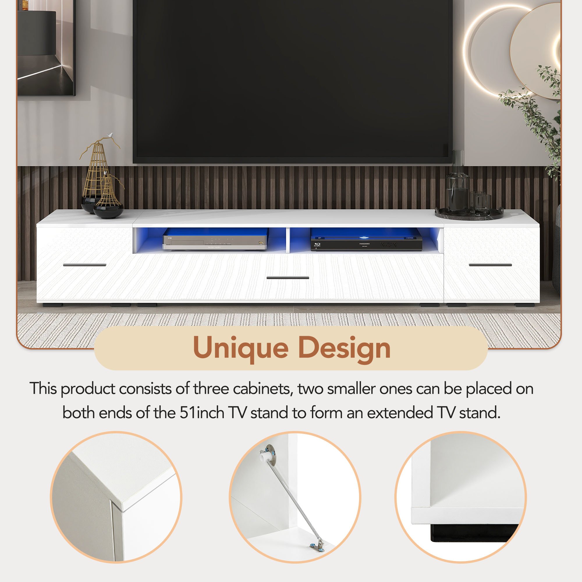 Unique DesignThis product consists of three cabinets, two smaller ones can be placed on both ends of the 51inch TV stand to form an extended TV stand, or placed anywhere in your home as end tables. The harmonious and unified shape brings a more elegant and chic touch to your home.