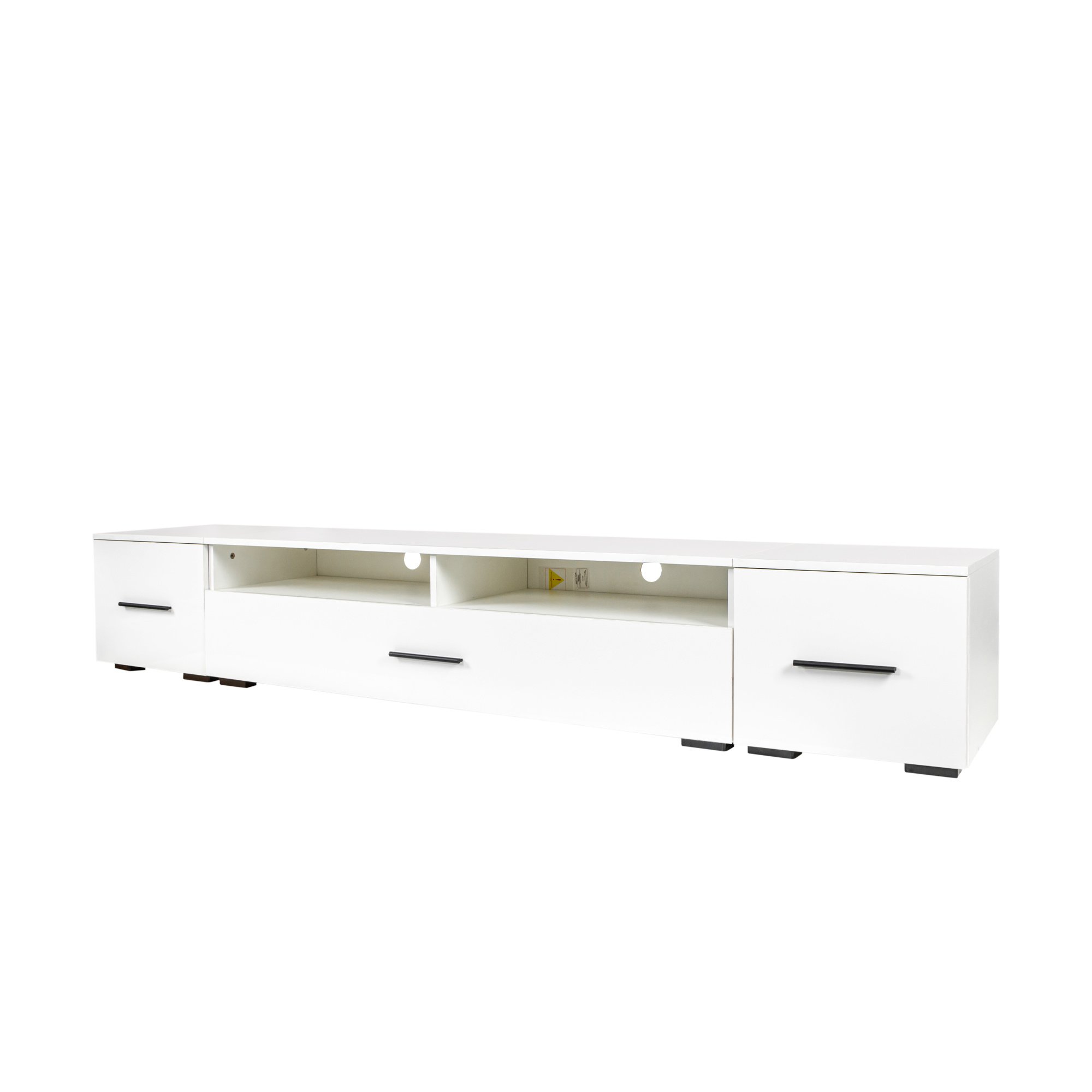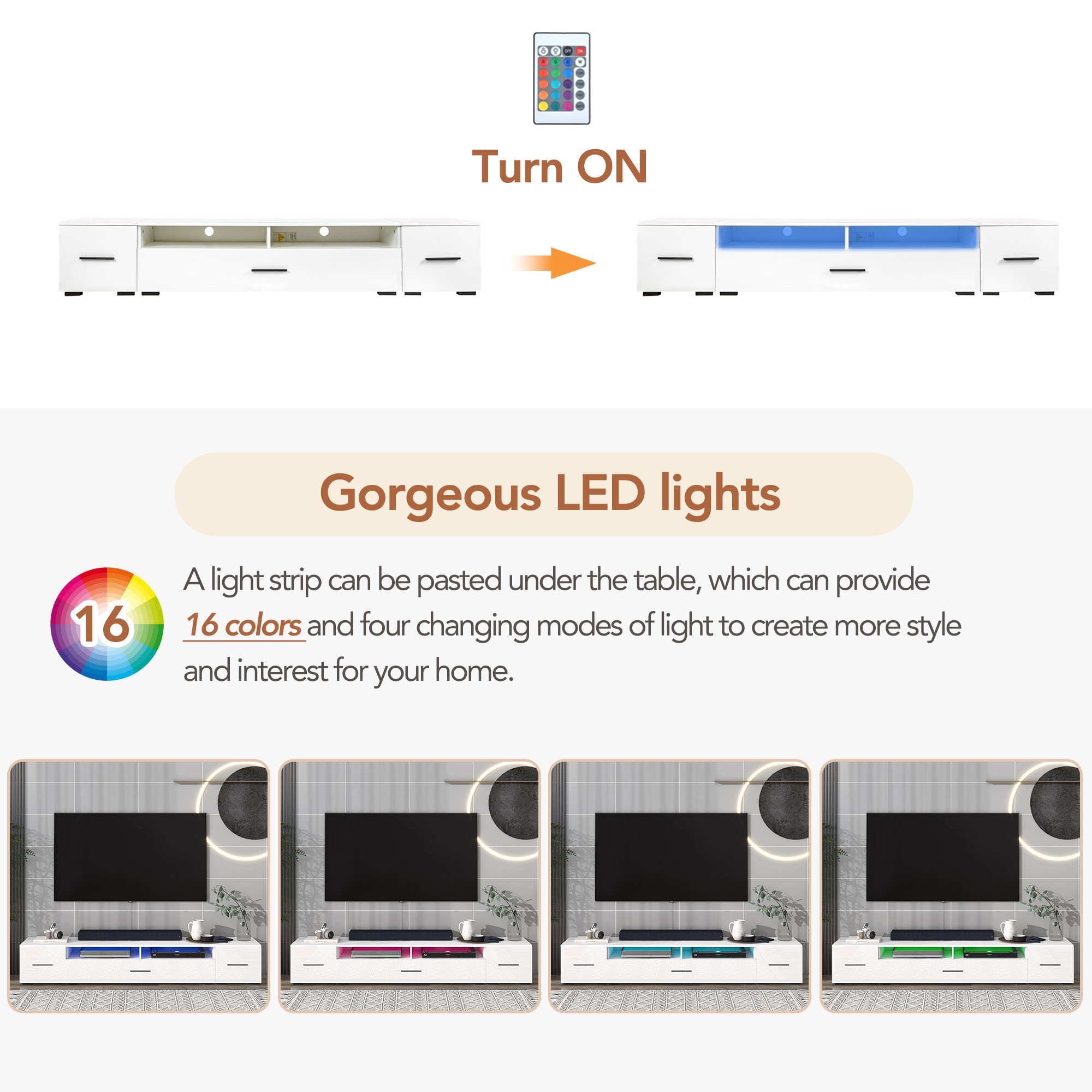 ExtendedThe TV stand, can match TV sizes up to 93inch. It can be split into three cabinets, and the smaller ones can be used as end tables.Built-in Lighting, a 16 color LED lights system with remote color control and on/off switches.
