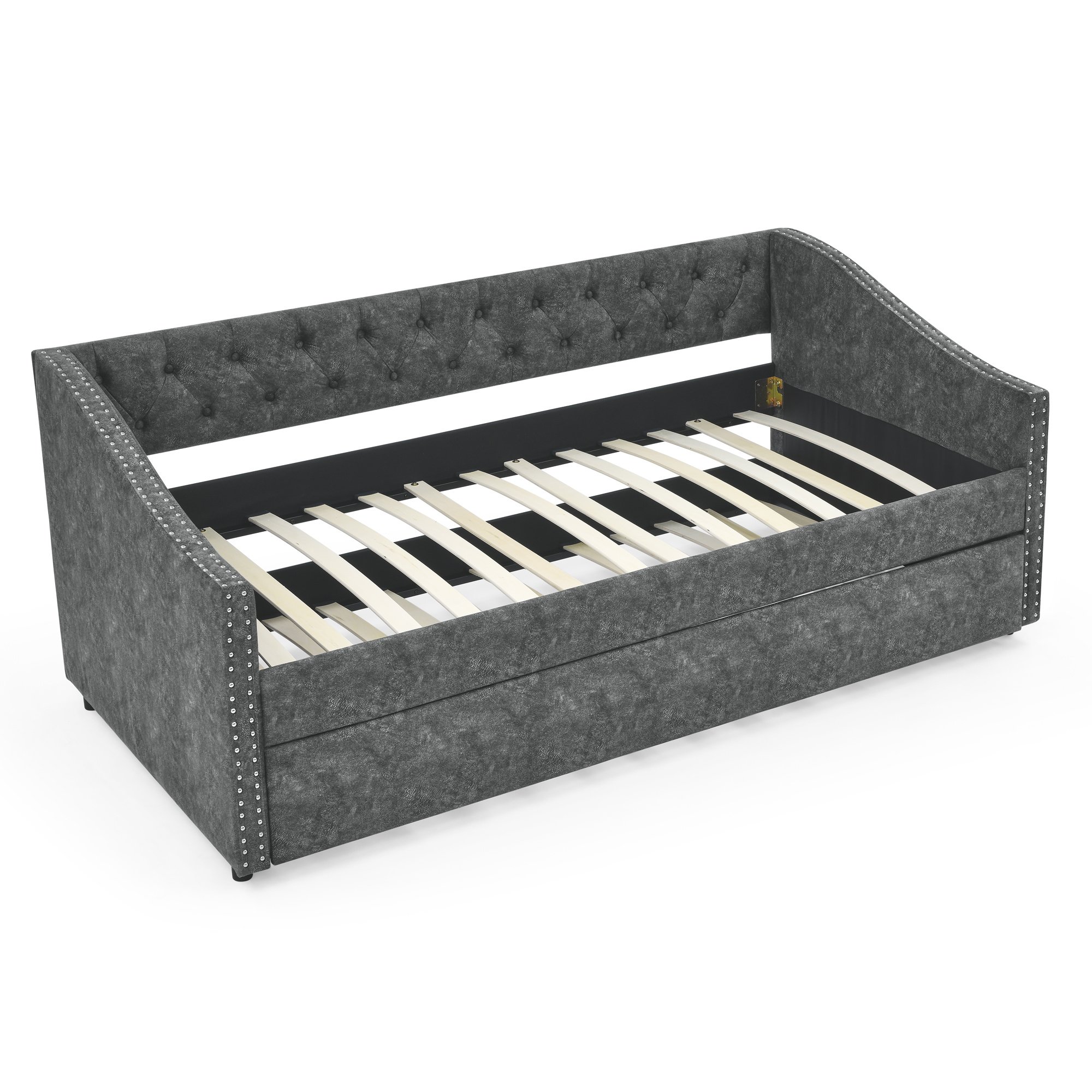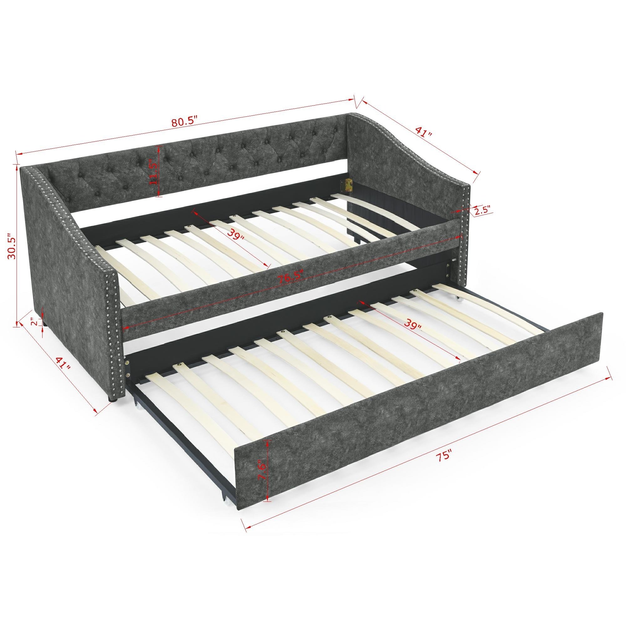 > Twin Size Daybed with Twin Size Trundle Upholstered Tufted Sofa Bed, with Button on Back and Copper Nail on Waved Shape Arms, Grey (80.5"x41"x30.5")