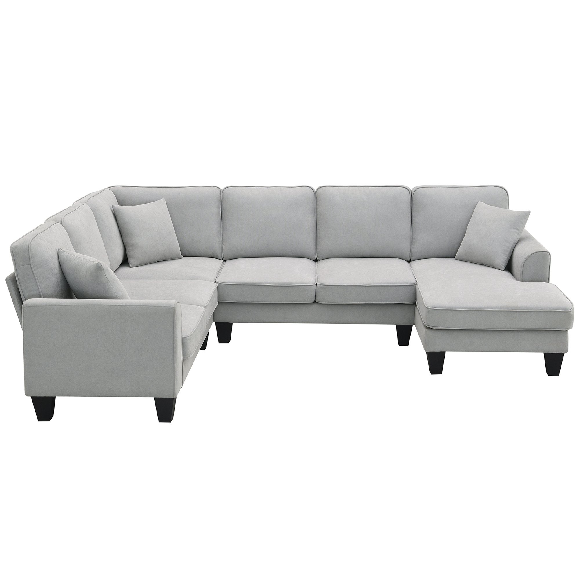 For a living room with stylish, comfortable and spacious seating, the U-shaped sofa will meet your needs. Featuring gray upholstery, this sofa is both versatile and stylish. And, when it comes to comfort, this sofa delivers with its huge seating area and extra accent pillows. With all these great features, you'll have a balanced room with character.