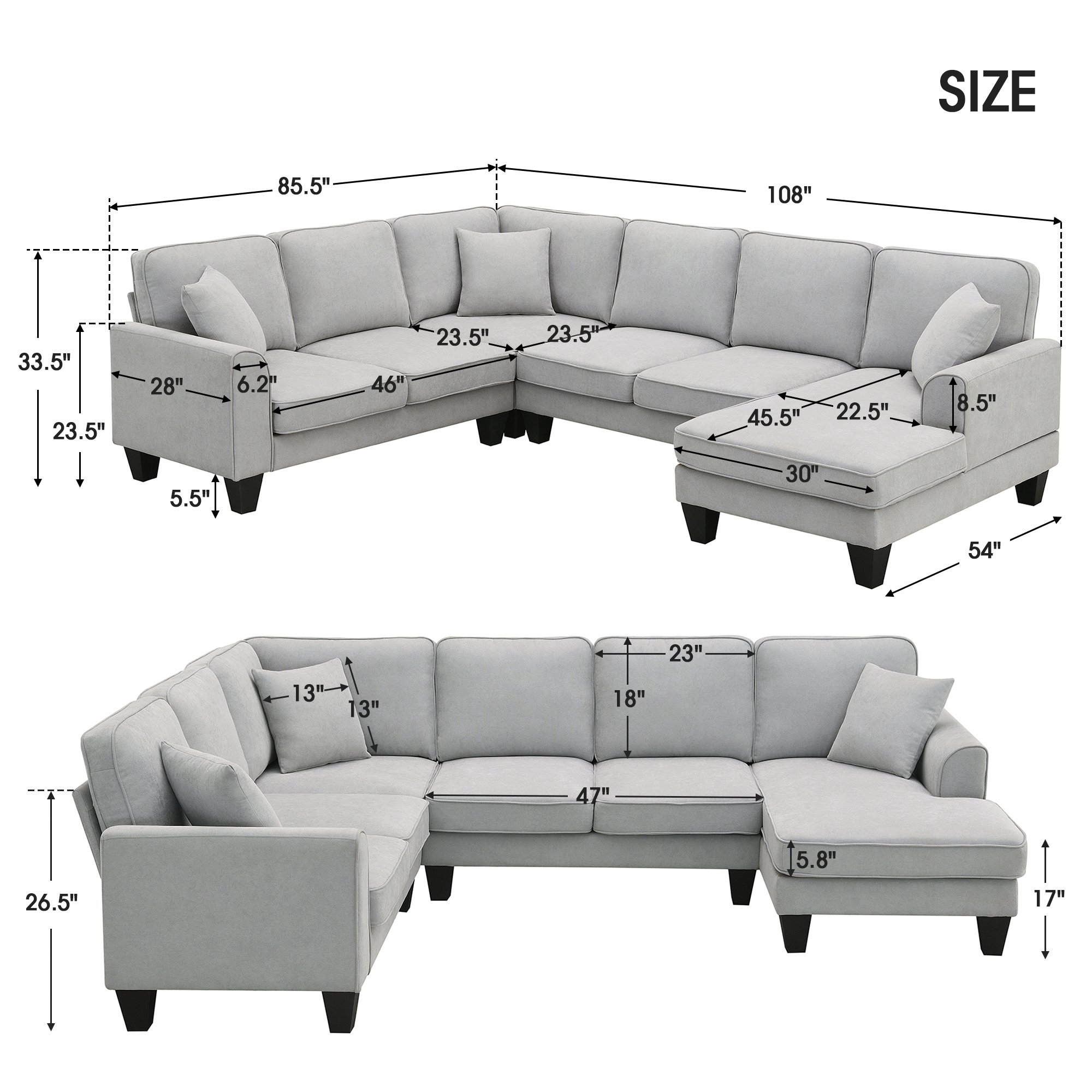 ✅Notes & Dimensions: This product is shipped in 3 packages with overall dimensions: 108''W x 85.5''D x 33.5''H; Weight Capacity: 330lbs/seat. This sofa will be shipped from the US in a total of 5 packs.